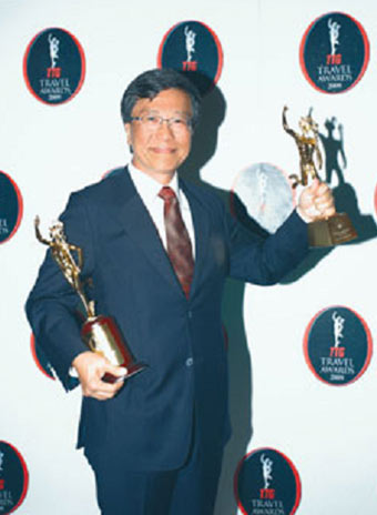 丽星邮轮主席兼行政总裁丹斯里林国泰手持“年度旅游企业家”和“TTG旅游大奖荣誉堂”奖座