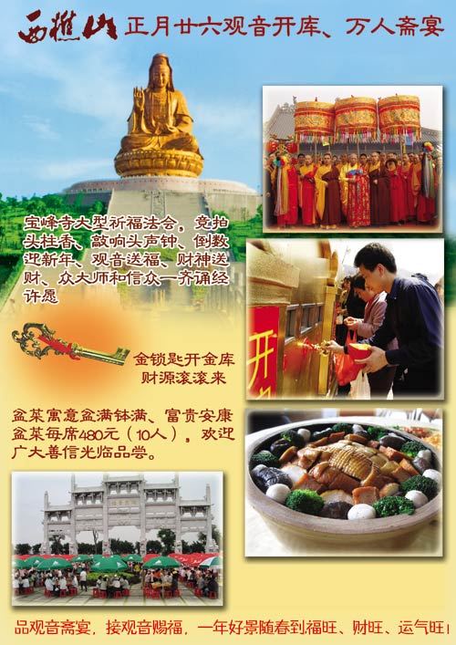 观音开库日中午,西樵山将在云海莲台景区举行万人盆菜斋宴。斋菜有鱼、鹅、鸭、鸡等,看起来像荤菜,其实却只是形似与神似,全部材料都是由素菜制成。10多种斋菜放一个大盆里,烹调出诱人的味道,数里之外仍然能够闻到香味。据了解,每年斋宴都爆棚,今年要吃斋宴的客人需要早早报名,免得到时没位看着别人吃得有滋有味,自己却垂诞欲滴。