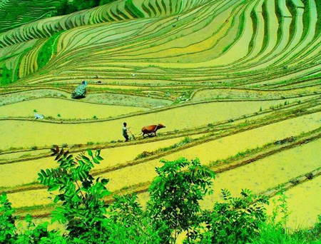 从高处望去,龙脊梯田展现了动人心魄的曲线美。  龙脊梯田始建于元朝,完工于清初,距今已有650多年历史。山脚盘绕到山顶,小山如螺,大山似塔,层层叠叠,高低错落。从高处望去,梯田的优美曲线一条条、一根根、或平行或交叉,展现了动人心魄的曲线美。春季,农民开始往梯田灌水育苗,整个梯田景区一片生机勃勃的景象。