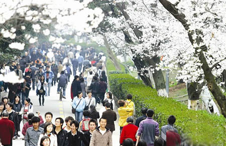 每年阳春三月,在被誉为“中国最美的大学”武汉大学内,春天的气息吹拂山野,也唤醒沉睡了一年的樱花。校园内的1000多株樱花竞相绽放,一株株,一排排,白如霜雪,灿若云霞,如朵朵轻飞的云,十分绚丽夺目,使原来宁静的校园成了一个热闹的春天公园。从学校正门牌坊到珞伽山的校道上,挤满了兴高采烈、成群结队前来赏樱的人们,处处花似海、人如潮。