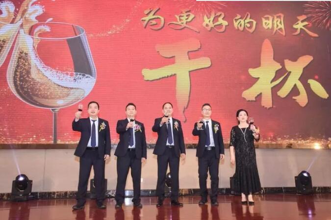 随后,黄冠明副总(下图右二)、林超副总(下图左二)、胡振军副总(下图左一)、梁敏副总(下图右一)上台与董事长林栋礼先生(图中)举杯祝酒,预祝大方旅游在2019年再创辉煌!