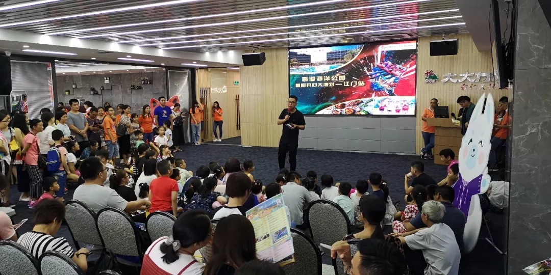 活动开始,首先由香港海洋公园华南区首席代表李婉仪女士,和大方旅游常务副总经理黄剑恒先生分别为本次活动进行简短的发言,并邀请了8位小朋友一起上台共同启动本次“香港海洋公园暑期开心大派对~江门站”活动